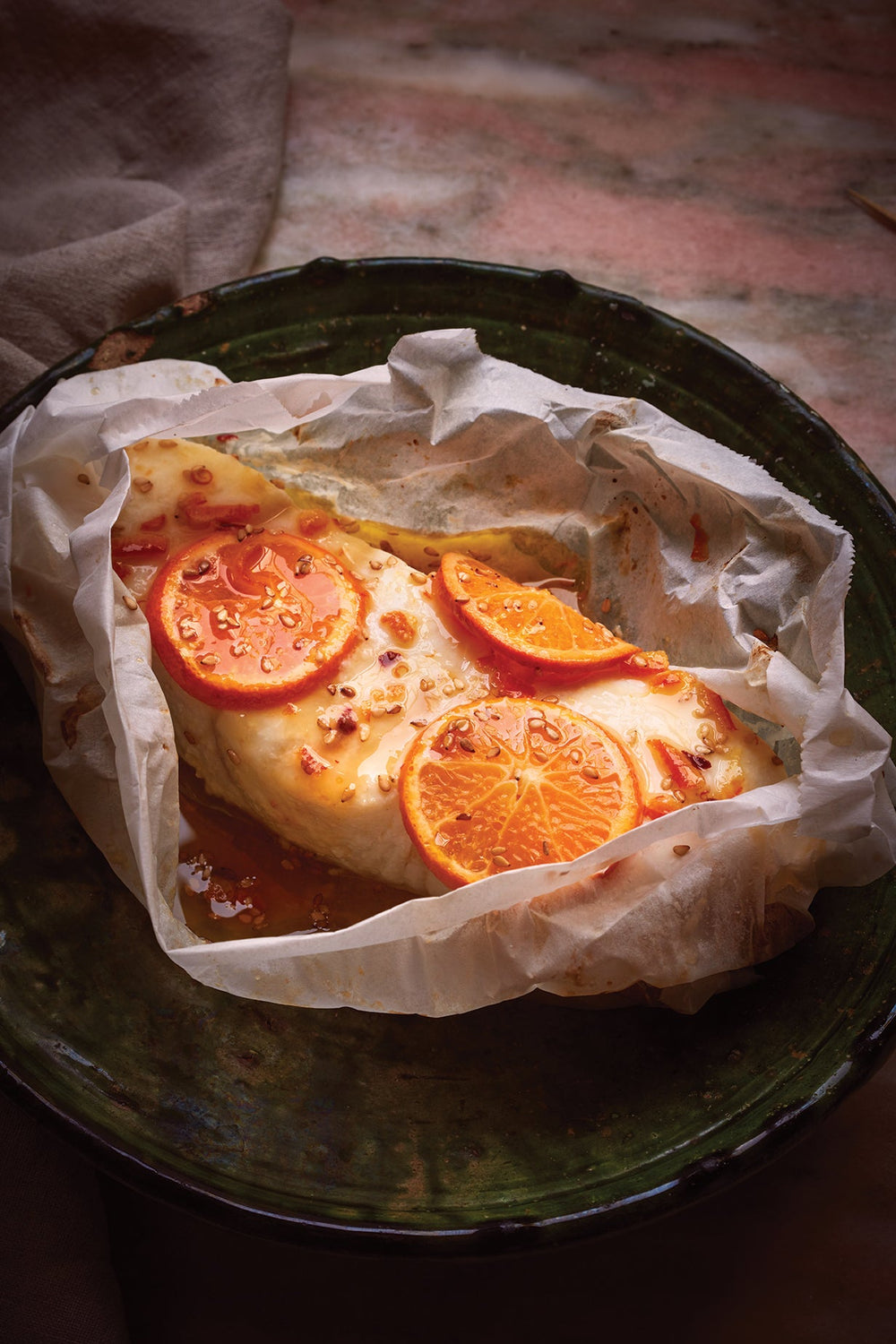 Cut 4, 10-inch lengths of parchment. Place 1 piece of halibut and 2 tbsp of marinade on one half of each sheet of parchment, top with Cara Cara slices. Fold the parchment over the fish and beginning on one side, make 1-inch folds along the edge, creating a half moon shape and folding final piece under to secure.