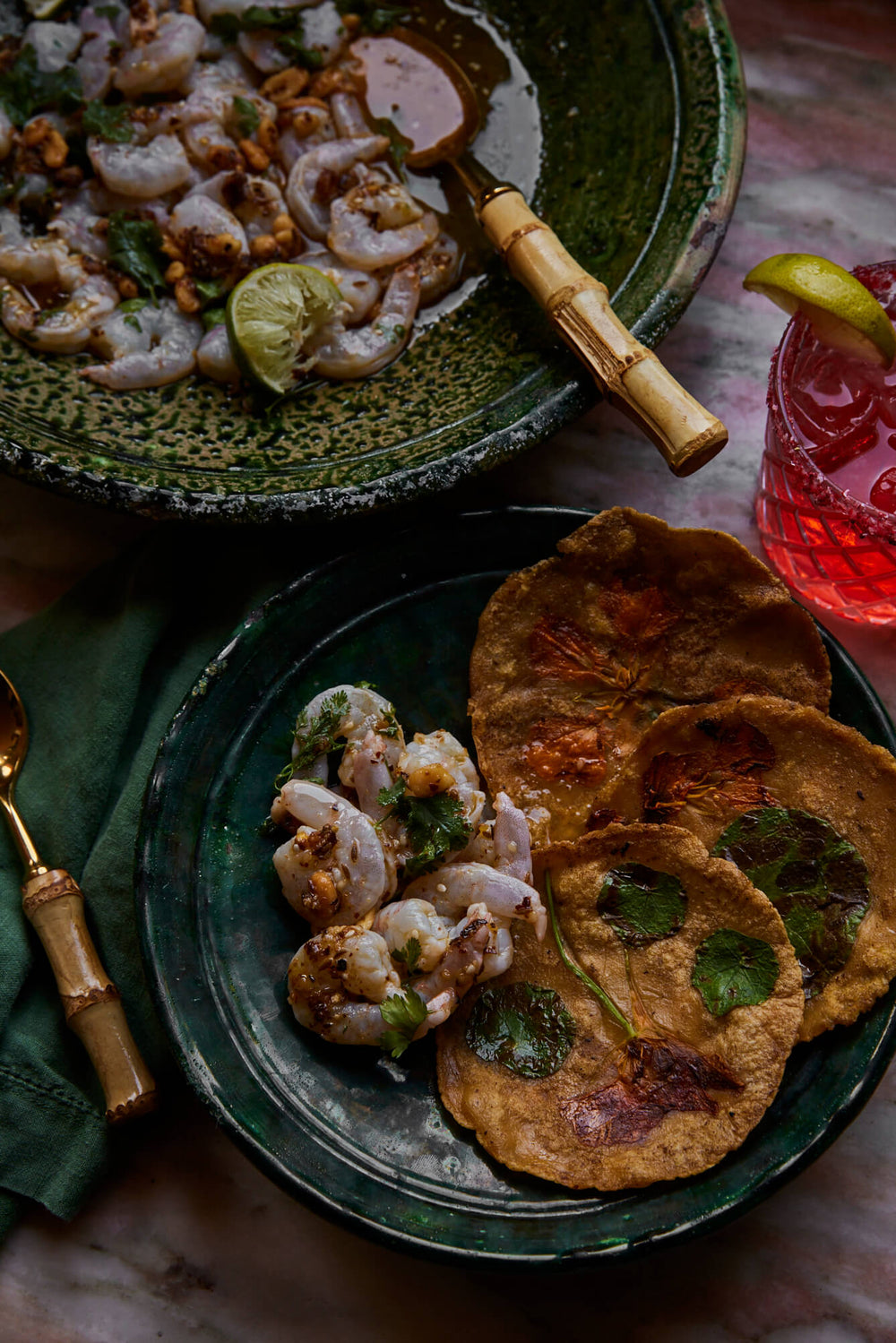 For assembly, add the shrimp to a bowl and cover with lime juice, reserving 2 Tbsp. Let sit for 20 minutes and then strain.