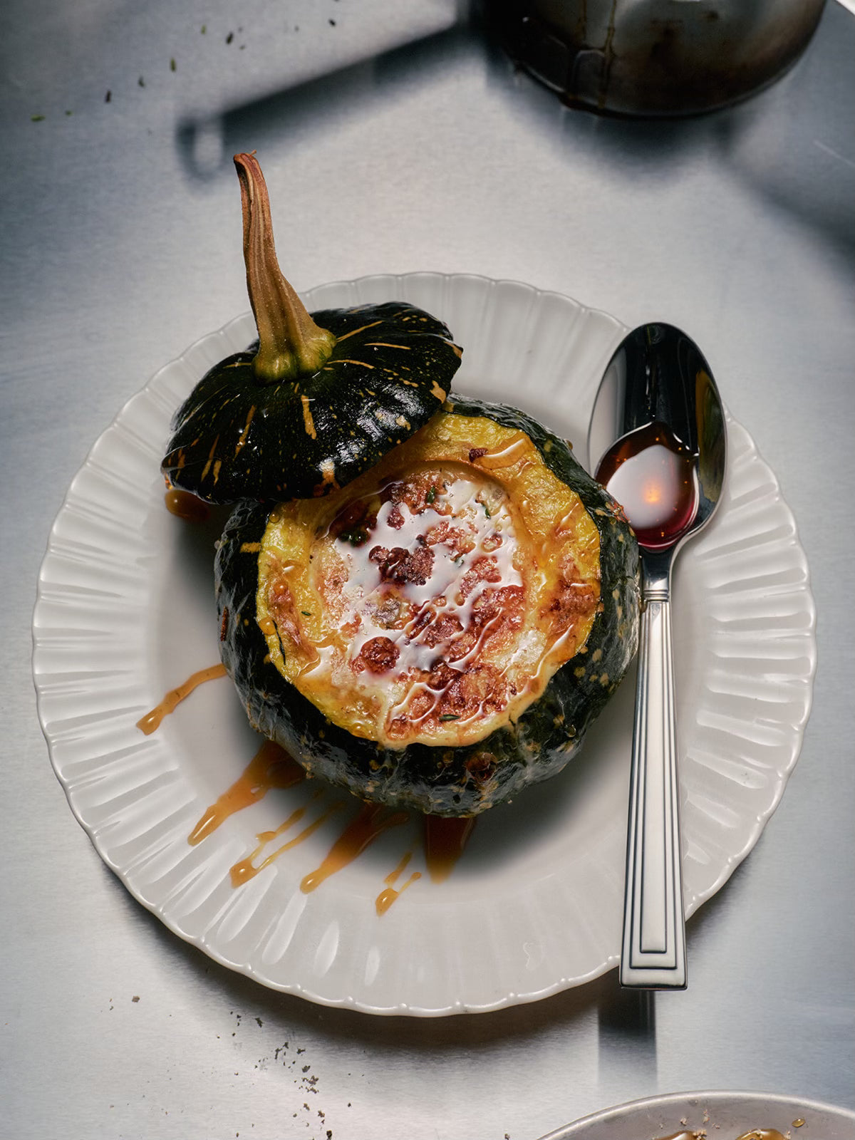 Mix cream and nutmeg in a measuring jug and season with salt and pepper to taste. Pour the cream into the pumpkin cavities. You may not need all the cream. Top the squash with their lids and roast until very tender. This will take about 1 hour, but will vary depending on your squash. Remove the lids and bake until the stuffing is golden brown, another ten minutes. Serve drizzled with Flamingo Estate Wildflower Honey and more Olive Oil.