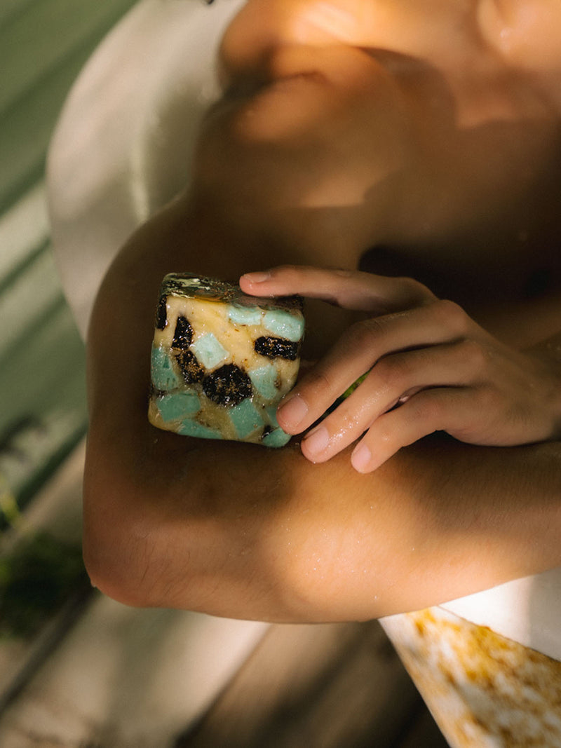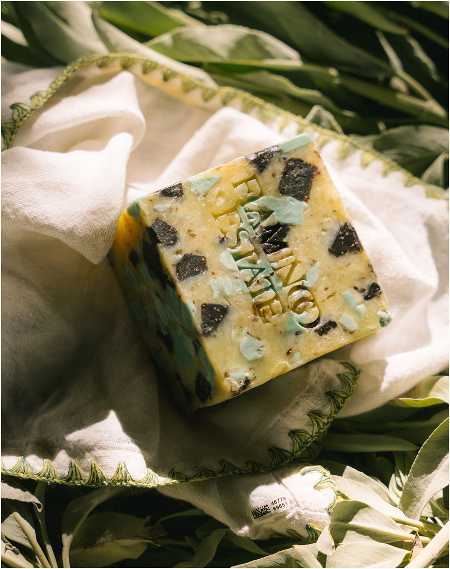 Wash over to the green, electric scent of rain-soaked hills—captured in a hand-crafted terrazzo bar that blends precious bits of resinous Clary Sage into our Petrichor soap bar.
