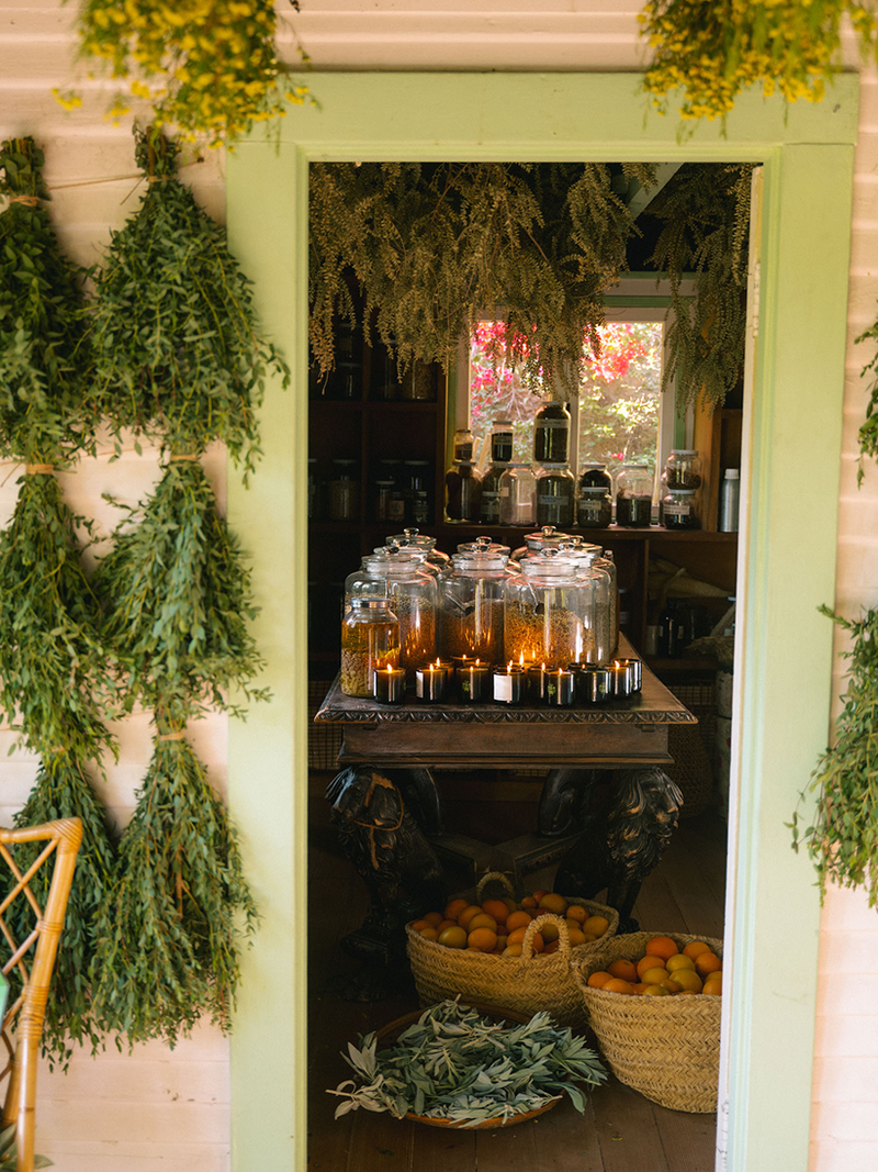 Naturally, it is the most fragrant place on the property, with ingredients and botanicals coming and going all day. Spring is the best time, when the rafters grow heavy with Sage and Citrus.