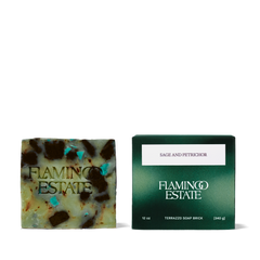 In spring, the Goat Shed fills with the scent of crushed Sage and damp earth—the air after the garden’s been watered, when the whole estate seems to exhale. This Soap Brick captures that feeling, blending resinous Clary Sage with a Petrichor accord of Kelp, Eucalyptus, Myrrh, and Vetiver in a rich base of Olive and Babassu oils. The result is a terrazzo bar that feels like the hills after rain: green, cleansing, deeply alive.